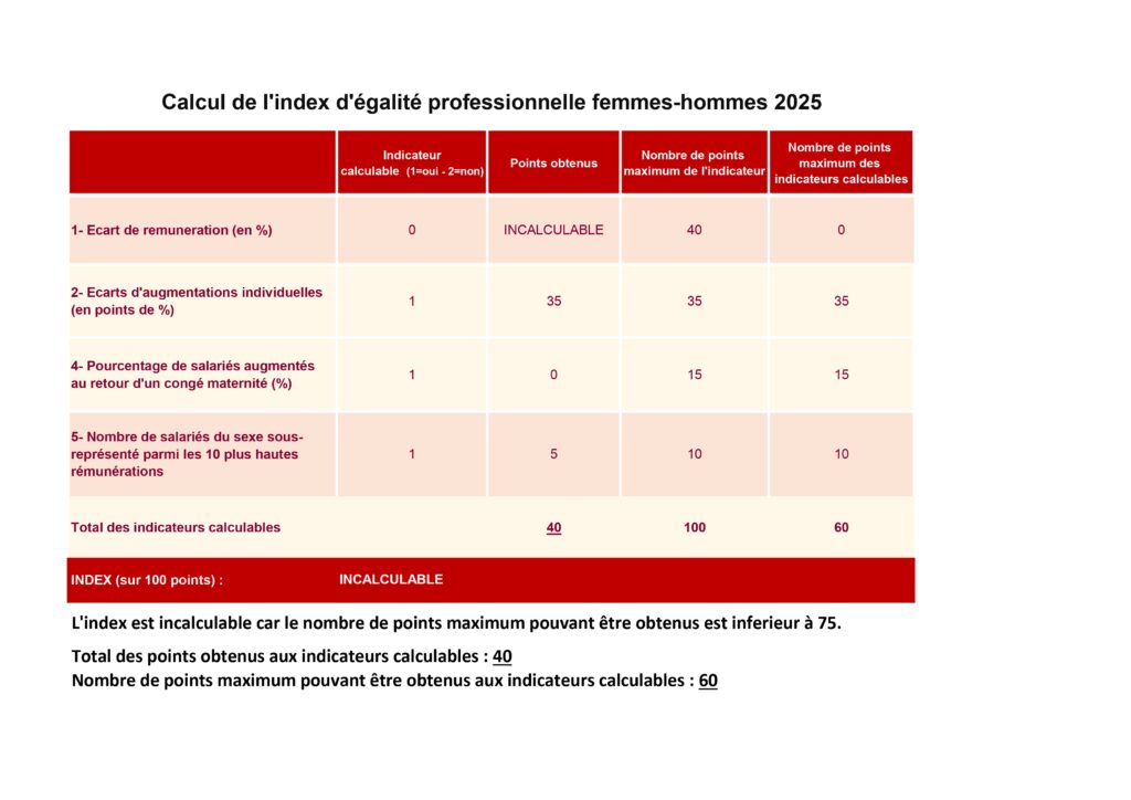 Cependant, en raison de la taille de notre effectif, l’index est incalculable pour l’année 2025.